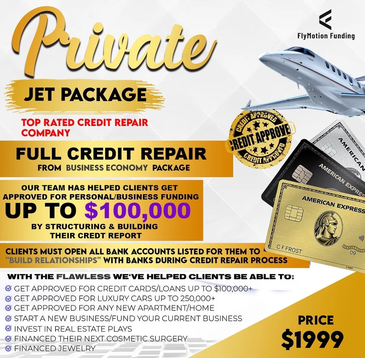 OUR NETWORK IS YOURS !! $1,500.00 CREDIT REPAIR + LIST OF PRIMARYS $1,000.00 BUSINESS PACKAGE Sale Price: $1,199.00 Original Price: $1,400.00 Sale LIFT OFF PACKAGE Sale Price: $800.00 Original Price: $950.00 Sale FIRST CLASS FLIGHT PACKAGE $1,599.00 PRIVATE JET PACKAGE $2,000.00